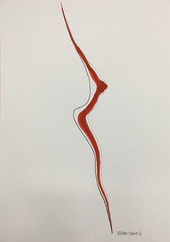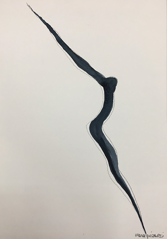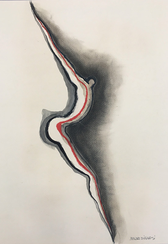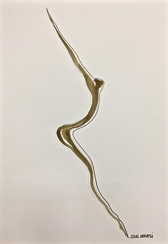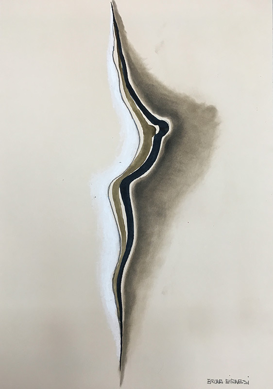 Contorni sinuosi, le ultime opere di Bruno Gianesi, riportano al disegno puro, quasi grafico , antico e primo amore dell’autore. Dopo varie sperimentazioni con la pittura, la materia e il tessuto in particolare, dopo un’espressione artistica dove il particolare, il dettaglio sono protagonisti, dove l’amore per il corpo lo portano a snaturarlo conducendolo ad un idea di corpo smontabile e rimontabile, retaggio soprattutto del surrealismo a cui Gianesi ha dedicato un’attenzione costante, e dove diventano protagoniste le maschere, le marionette e i pinocchi, Gianesi sente l’esigenza di esprimersi in modo più diretto, immediato. Semplici tratti, linee scarne che al primo impatto sembrano lontano dai precedenti lavori ma che, a ben osservarli, hanno invece un evidente rimando. Quei “semplici tratti” nascondono profili sinuosi di corpi femminili , seni abbozzati che diventano esili figure immaginarie , filiformi , sottili, eleganti e sensuali, tutti elementi costantemente presenti nelle opere di Gianesi. La moda, il teatro e l’arte, intesi singolarmente, hanno esercitato da sempre sulla inventiva dell’artista, un’attrazione totalizzante, che traspare chiaramente anche in questi ultimi lavori e che rivelano un ideale estetico rigorosamente classico e massimamente sensuale, d’altra parte