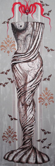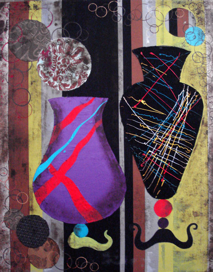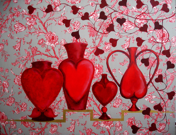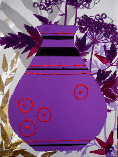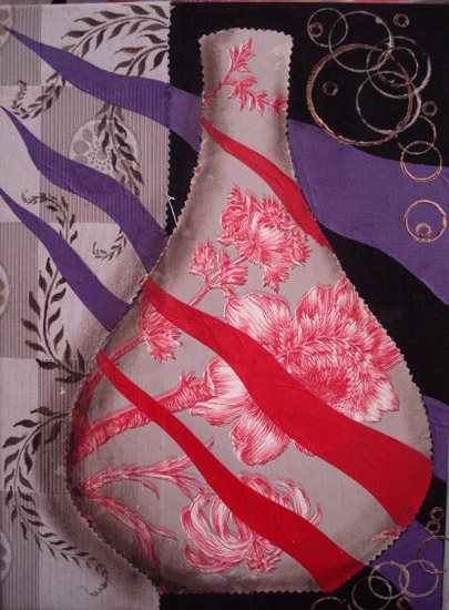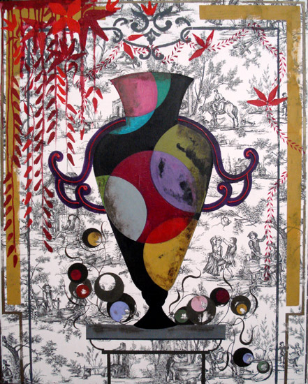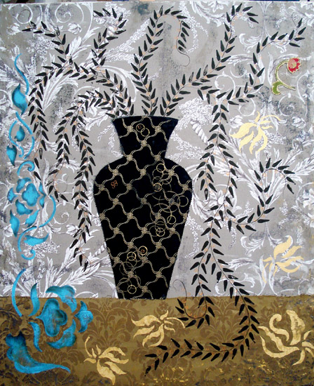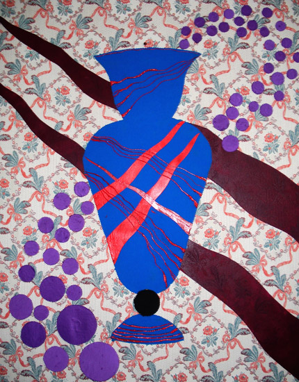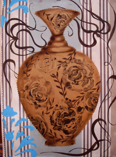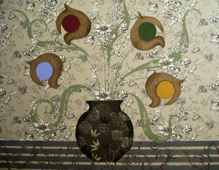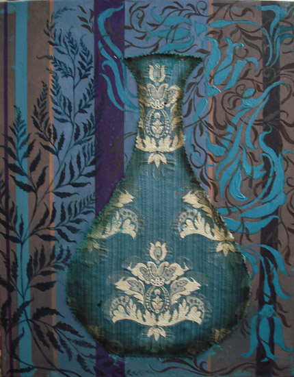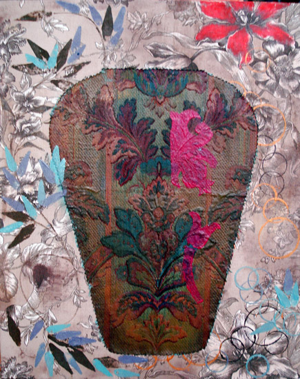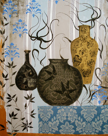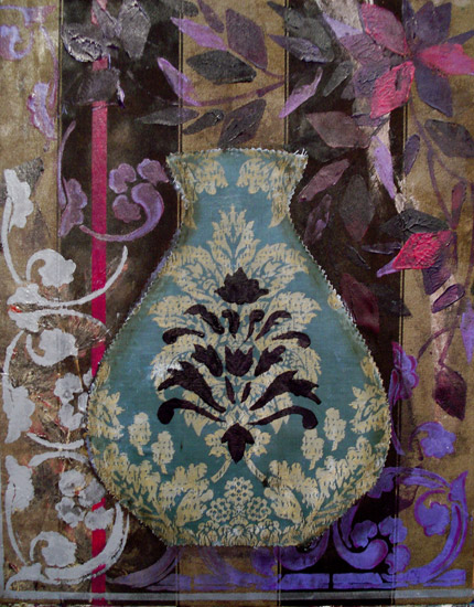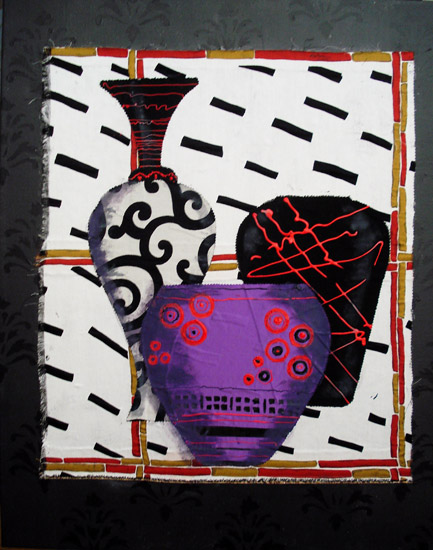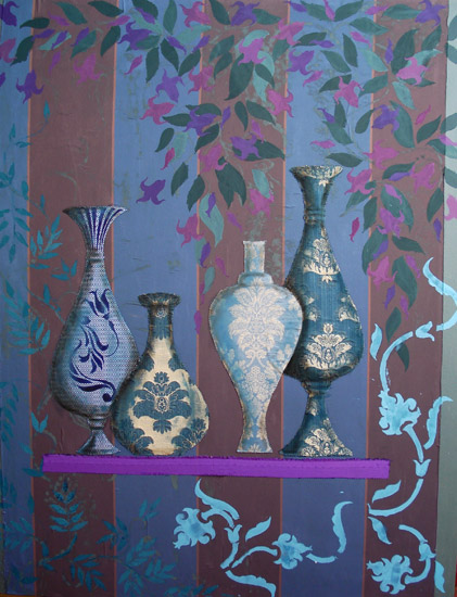 Questa volta l’artista miscela la forma del”pottery”, ossia dei vasi in ceramica, con il “tapestry”, l’utilizzo di vecchi tessuti da tappezzeria, broccati, damascati, jacquard, ecco che motivi floreali “fin de siècle” si mescolano con severi rigati da parati inglesi, ridondanti motivi barocchi con gioiose geometrie pop wallpaper e, attraverso l’intervento pittorico, il risultato finale è qualcosa di nuovo ed inedito con una propria anima.