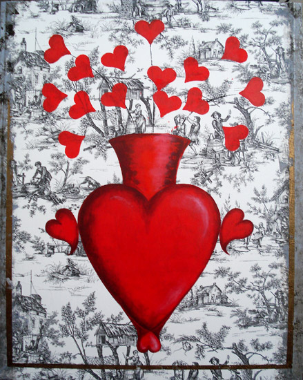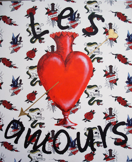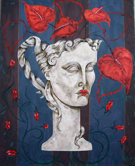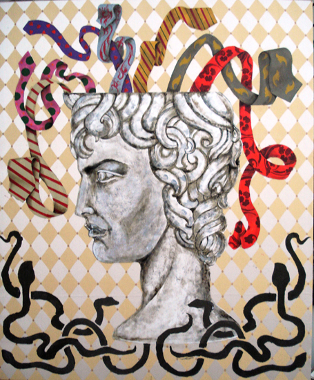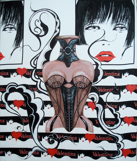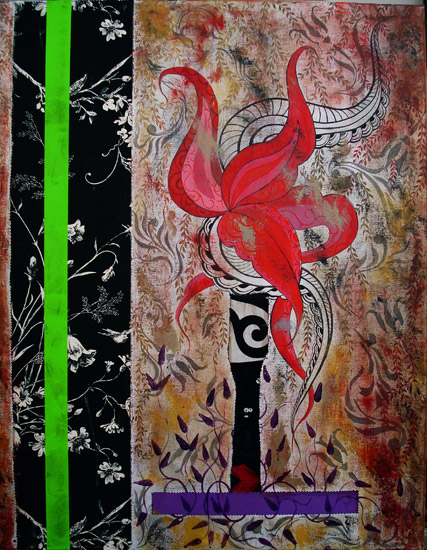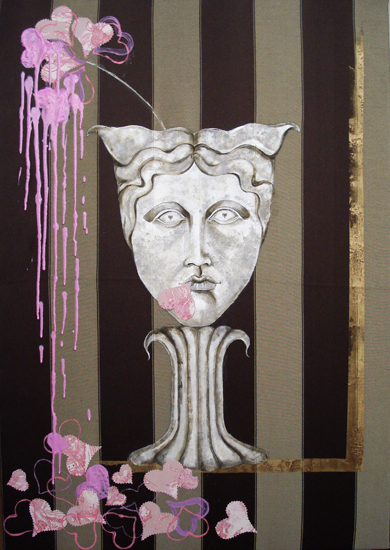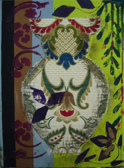 Tessuto e pittura sono l’uno lo sfondo dell’altra, in un rapporto di reciprocità che si nutre di ricercate dissonanze, di stridori intenzionali e mai del tutto acuti, perchè temperate dal mix, dal desiderio della commistione e dal piacere del guazzabuglio.