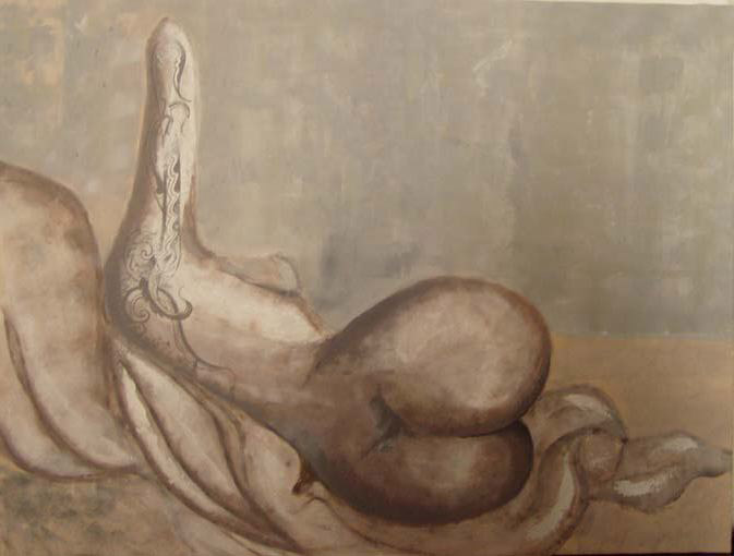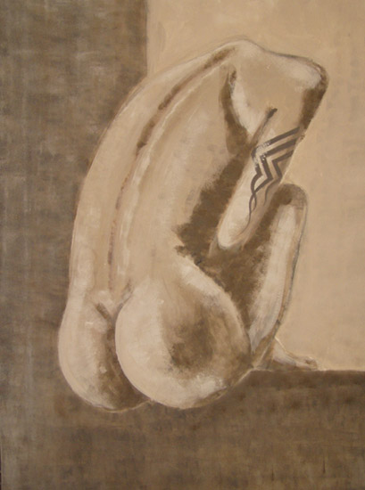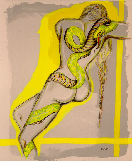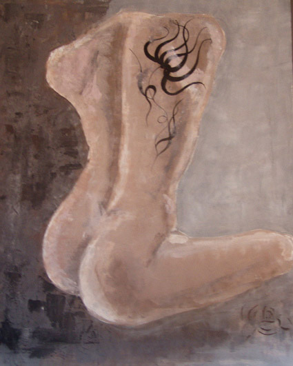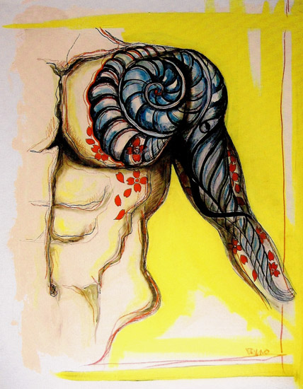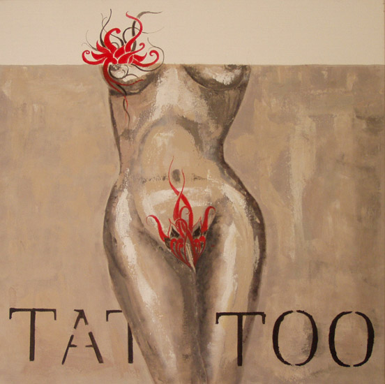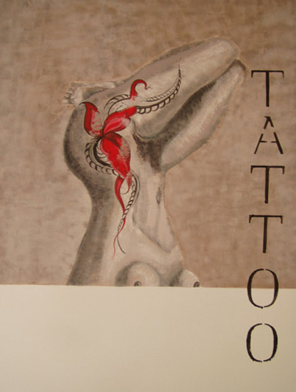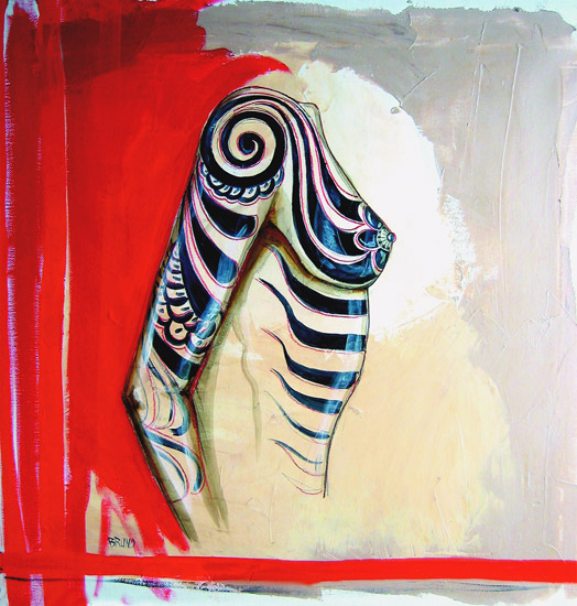 Facendo tesoro di queste due fruttuose esperienze creative, Bruno comunica oggi raffigurando corpi nudi vestiti di soli tatuaggi. Protagoniste delle tele sono alcune parti del corpo – visi senza corpo, busti senza testa, parti intime in dettaglio - ritratte di profilo oppure di fronte e vestite di tatuaggi che servono da trait d’union tra mondo antico e moderno. Il tatuaggio racchiude, da tempi lontani, un “valore sociale come marchio di identificazione e un valore di linguaggio in quanto il segno articolato completa il corpo dato rendendolo significante”.