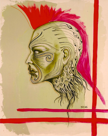 Corpi perfetti avvolti da segni che ne evidenziano le forme o visi fumettistici duramente squadrati, teste futuriste pettinate a cresta e rasate per lasciar intravedere il disegno tatuato, sono figure irreali che rappresentano la continuità tra l’uomo del presente e la sua storia.