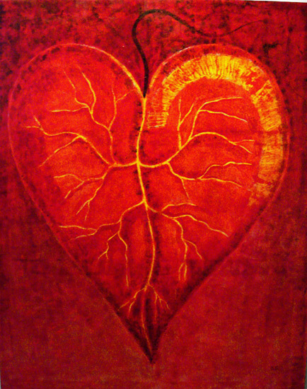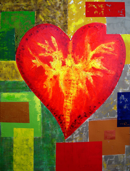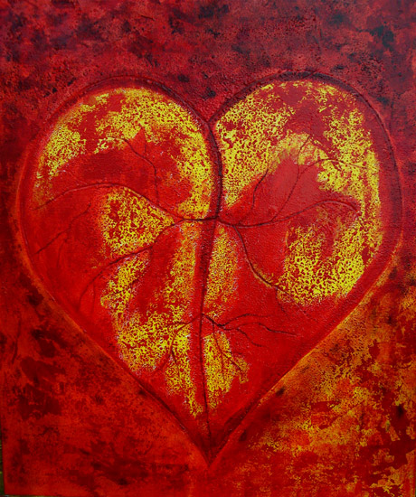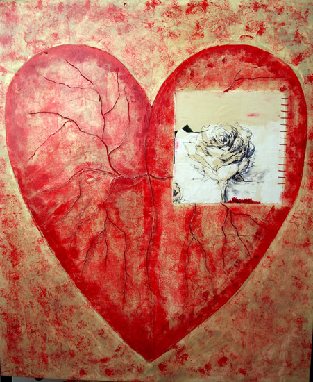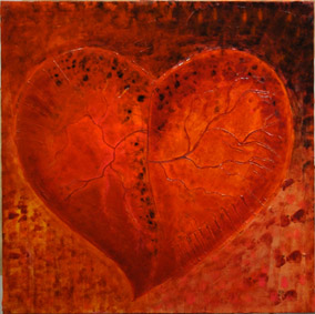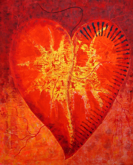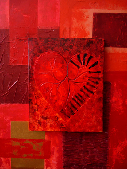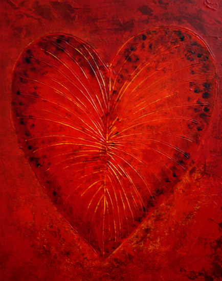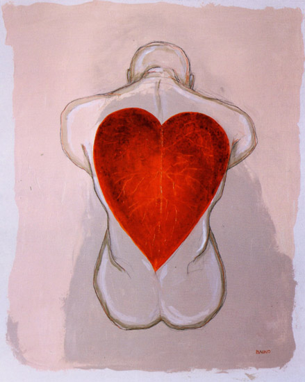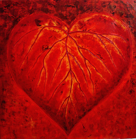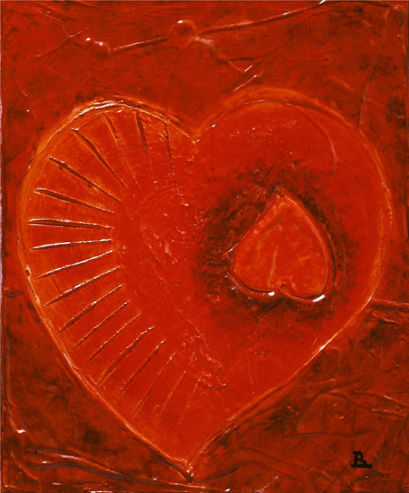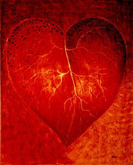 La ricerca pittorica di Bruno Gianesi prende avvio dal simbolismo e dal grafismo per evolversi verso una ricerca cromatica più profonda e un maggiore particolarismo. l’artista attraversa lo strato superficiale della pelle, entra nel vivo del corpo umano, dove circola il sangue, per arrivare direttamente alla fonte primaria della vita: il cuore. Rappresentato stilisticamente come una foglia e le sue venature, il cuore si imprime su una materia spessa di un vivo ed intenso colore rosso.