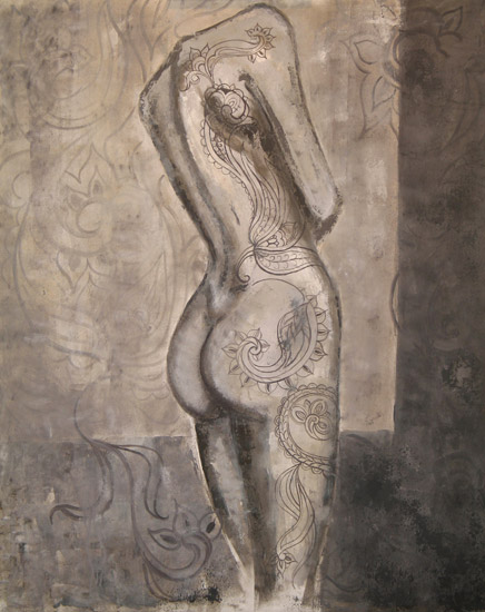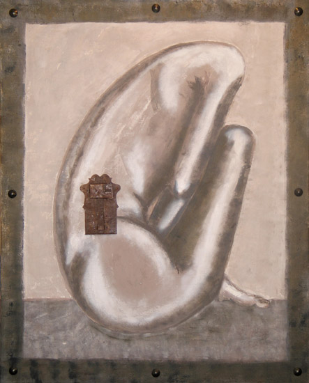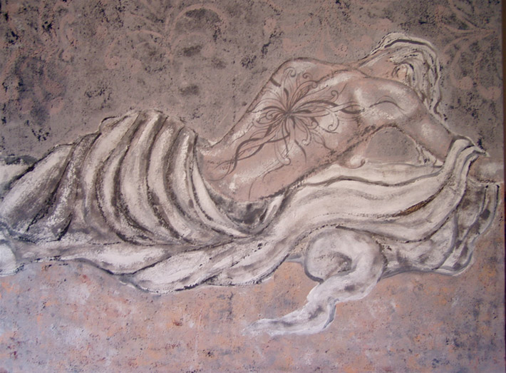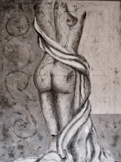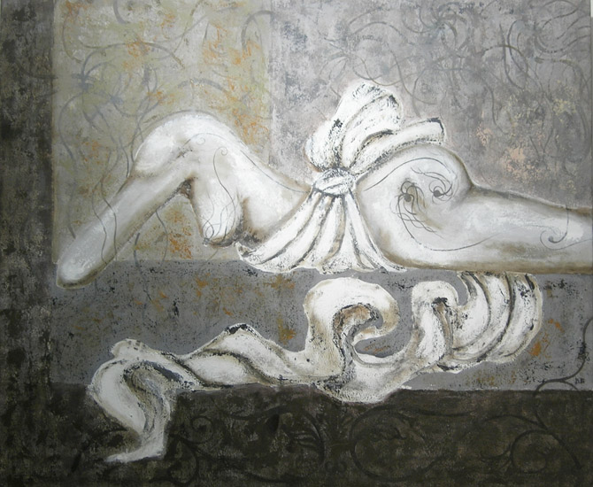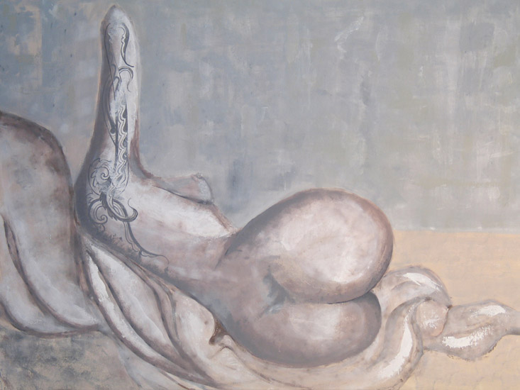 Dopo avere esplorato il corpo come scrittura, Gianesi giunge, infatti, ad interrogare lo spazio della seduzione. Due opere, mi sembra indichino, in questo senso, la chiave di lettura per intendere l’avvio della enclosure. Un nudo di spalle, acefalo ed avvolto in morbidi panneggi, il braccio mollemente adagiato alla spalliera di una dormeuse stile impero, marca con il suo profilo lo spazio dell’intimità; allo stesso ambito di sospensione temporale allude il frammento di corpo aggomitolato nel lenzuolo-sudario.